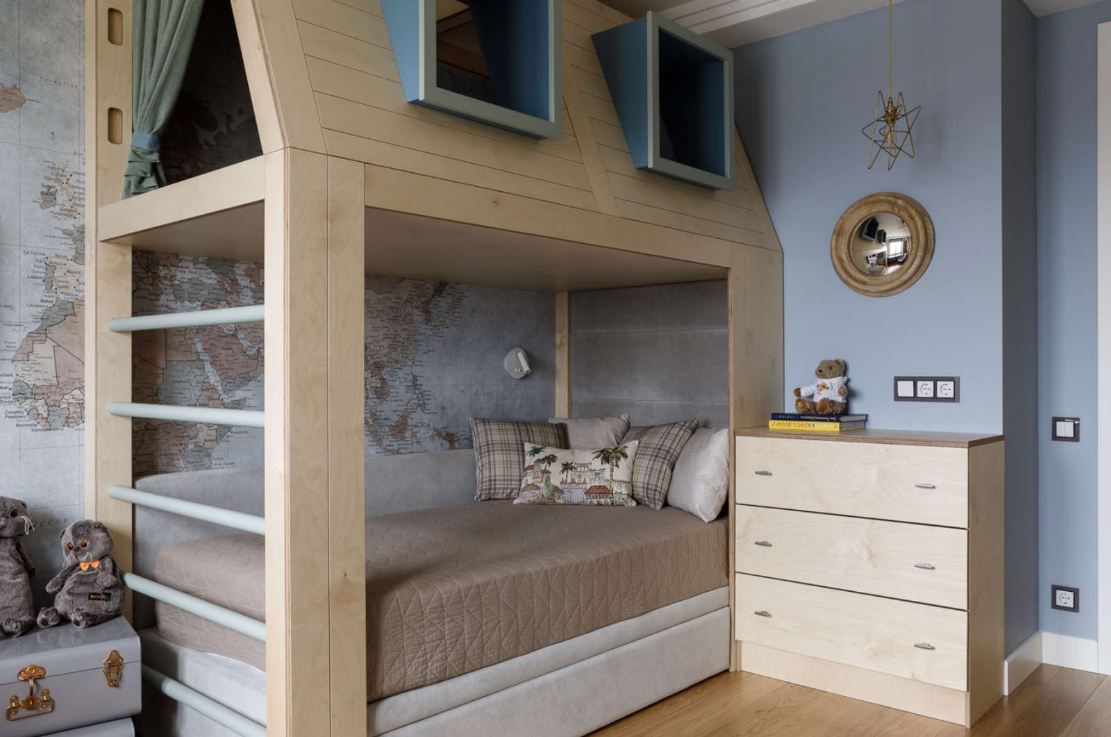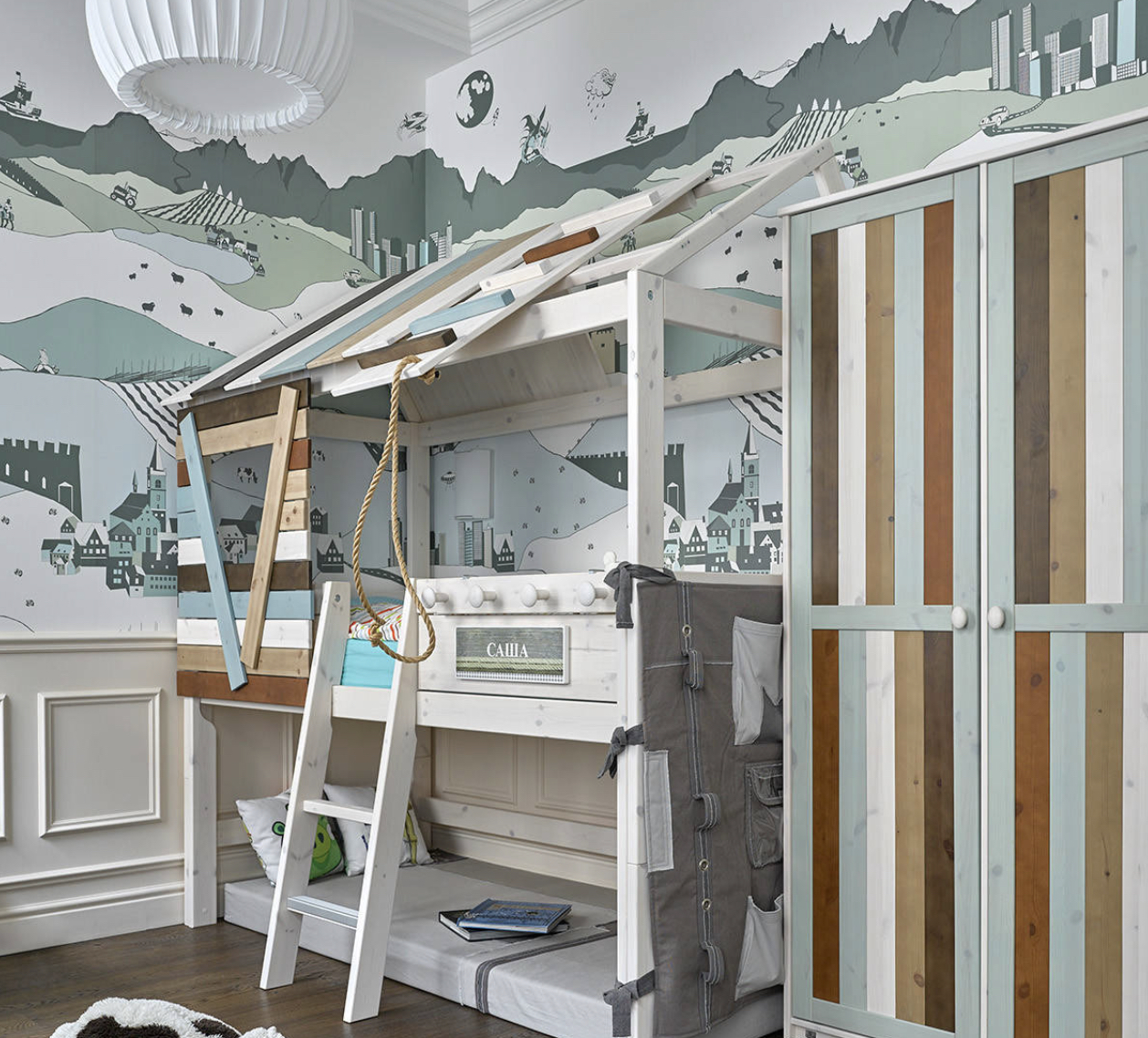 В комнате мальчика отлично смотрятся модели в виде рыцарского замка, двухуровневые конструкции, напоминающие домик на дереве, туристическую палатку или вигвам, добавляющие в обстановку дух приключений и путешествий.