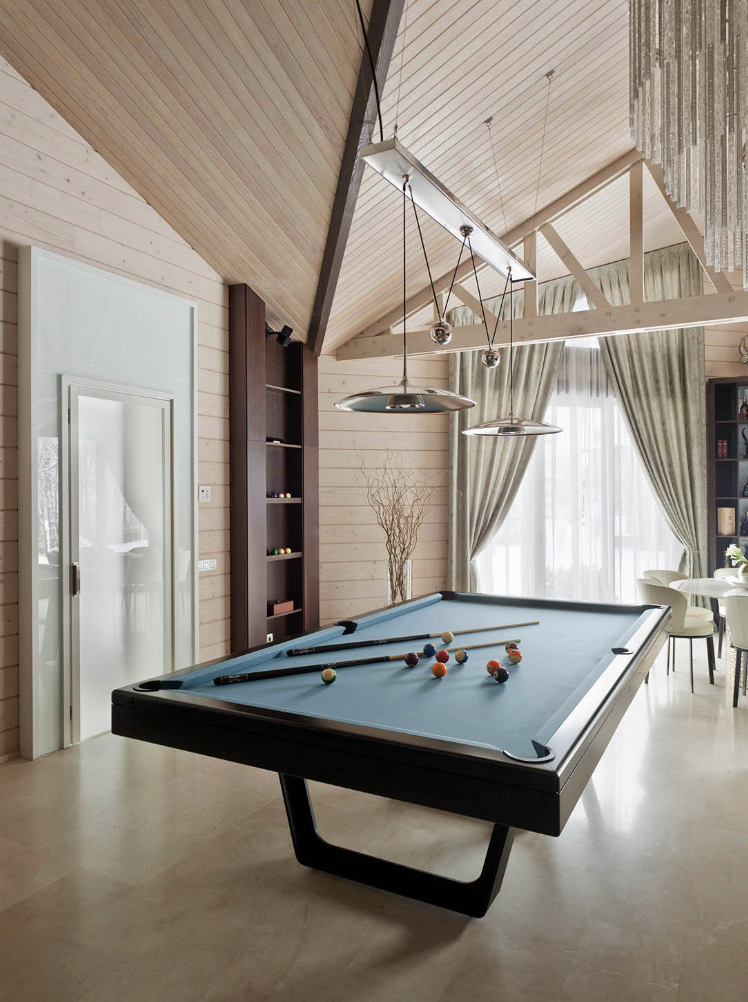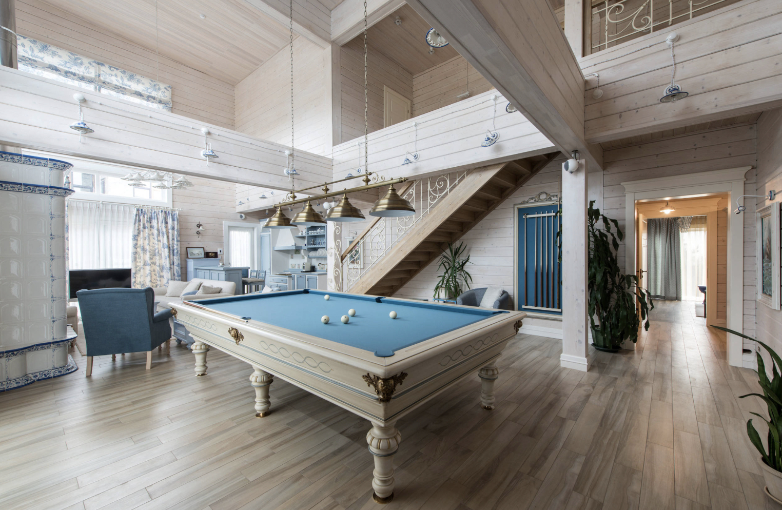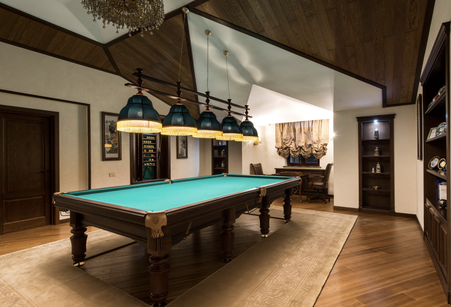 Где расположить бильярдную? Какое помещение под нее отвести? Этот вопрос лучше решать на этапе выбора проекта дома. В зависимости от размеров дома и количества в нем помещений, под бильярдную можно выделить как отдельную комнату, так и совместить ее с библиотекой, гостиной либо устроить в холле. Все зависит от возможностей и желания.