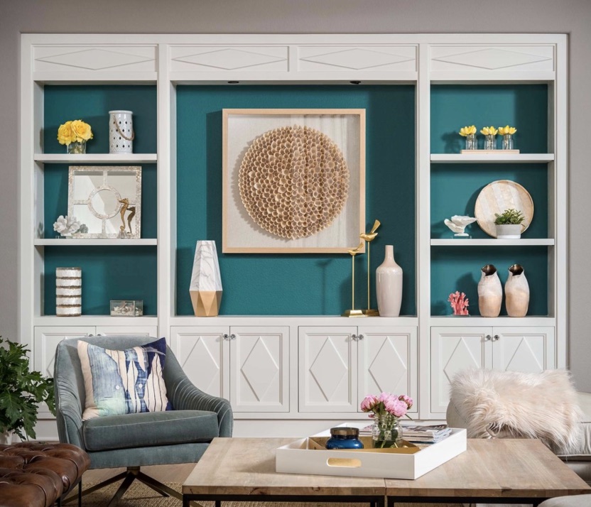 - Шкаф или витрина бирюзового цвета будут гармонично смотреться в просторных гостиных. В витрину без створок можно сложить посуду, которая будет перекликаться с общим интерьером, а дверцы шкафа могут украшать бронзовые клёпки или витиеватые ручки.