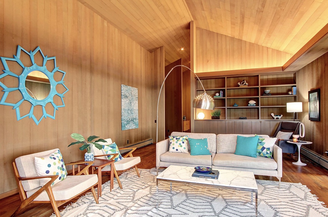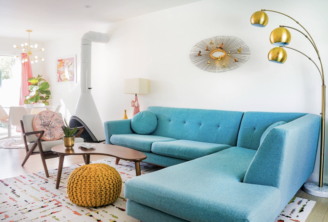 - Современный. Современный стиль наполнен простором и воздухом. Это отличительная черта направления. Пространство гостиной не перегружено лишними деталями и геометрическими формами. Бирюзовый цвет идеально подходит для этого стиля.