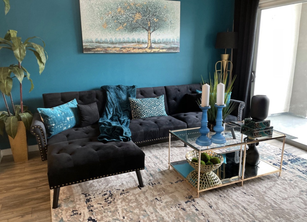 - Черно-бирюзовый. Композиция из бирюзового и черного напоминает бабочку морфо, которая отличается неповторимыми красками. Бирюзовая гостиная с элементами черного соответствует стилю лофт, классика, модерн.