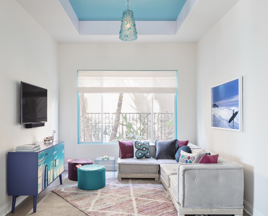 Интересным решением станет цветной пол или потолок. Плюсом будет наличие высокого потолка, это создаст впечатление бесконечности и свободы. Напольным покрытием может быть не только ковролин, но и ковер с замысловатыми узорами. Глубокий темно-бирюзовый цвет коврового покрытия шикарно впишется практически в любой интерьер.