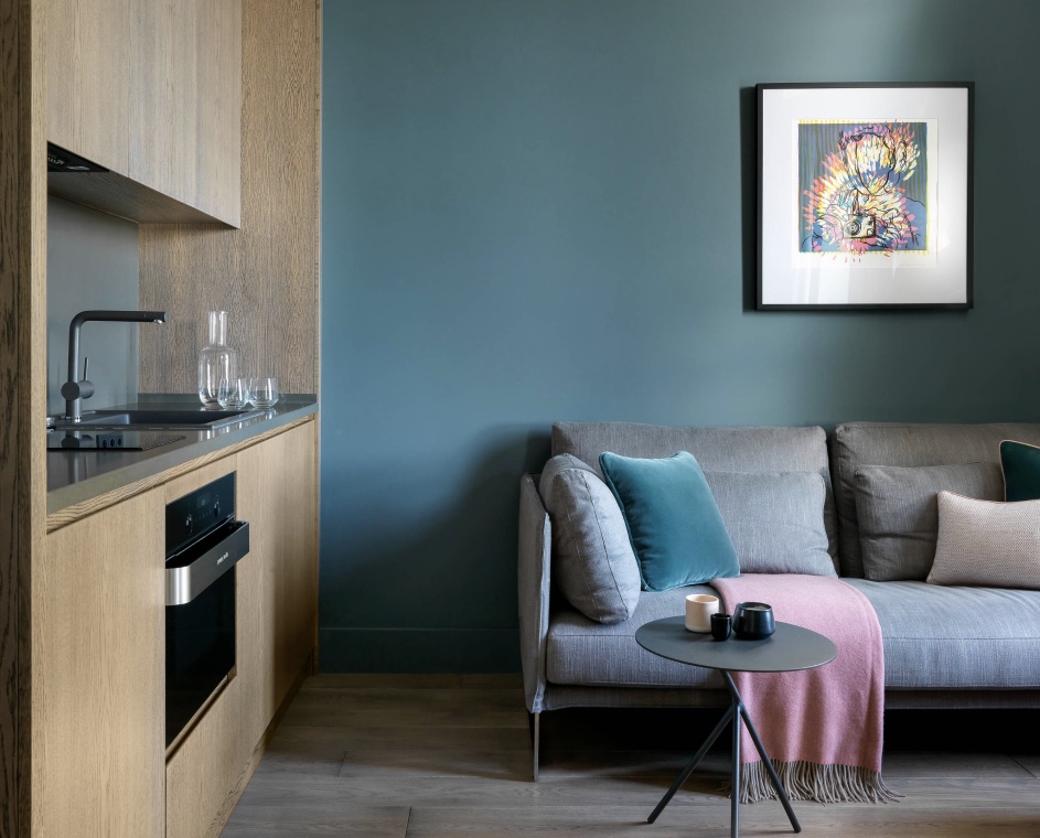 Выбор оттенка играет немаловажную роль в оформлении. Чем темнее цвет, тем больше он будет визуально скрадывать пространство. При выборе стен больше подойдет светло-бирюзовая палитра.