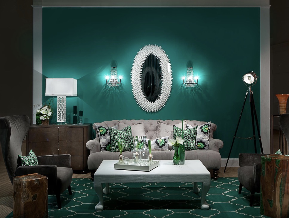- Серо-бирюзовый. Несмотря на то, что бирюзовый очень нежный цвет, в сочетании с серым может получиться брутальный интерьер гостиной комнаты.