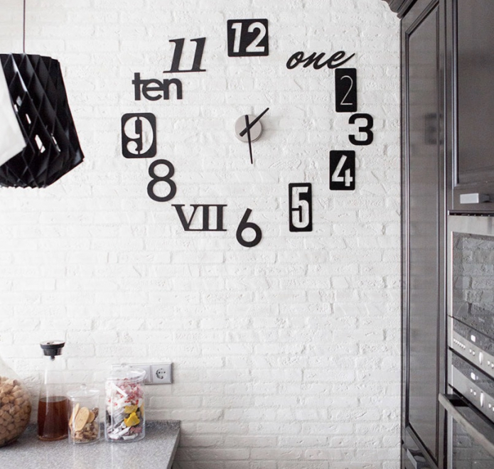 На фото оригинальные часы на стене в интерьере кухни, выполненной в светлых тонах.