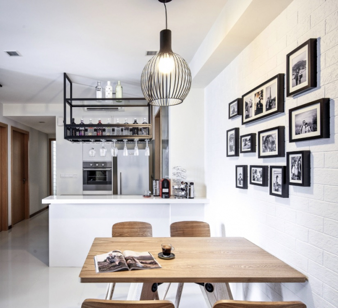Зону над столом также можно выделить, за счет светильников, бра или подсветки. Это создаст приятное освещение в комнате и добавит в нее камерности.