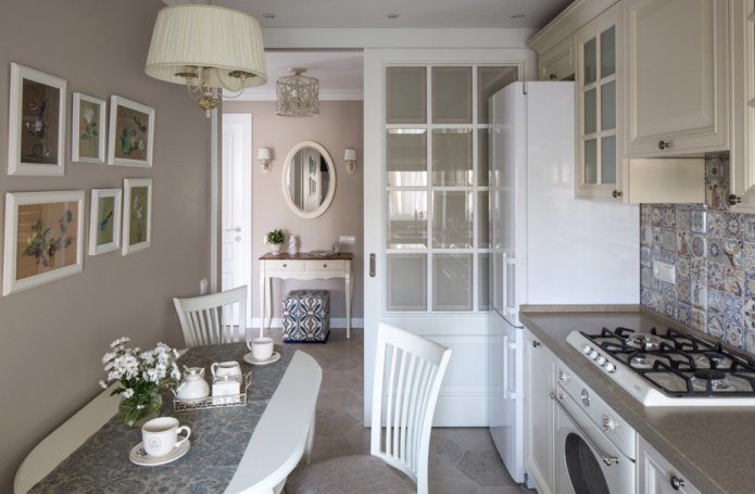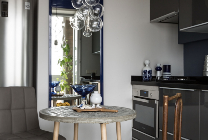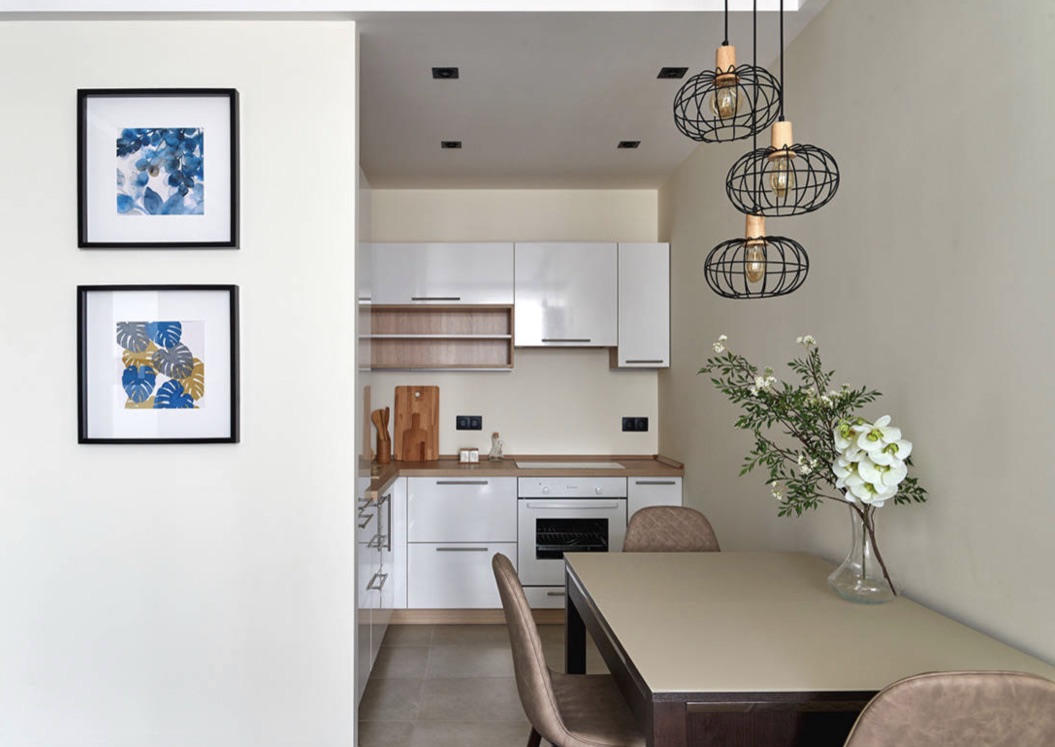 На фото кухня и дизайн обеденной стены с декором в виде зеркала, маленьких картин и настенных бра.