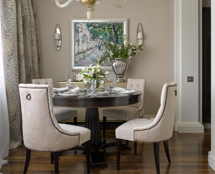 На фото классическая кухня со стеной, оформленной настенными бра и картиной.