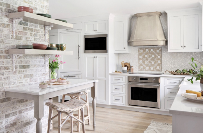 В данном стиле уместны винтажные элементы, обилие живых растений, букетных композиций, засушенных цветов в керамических вазах или плетеных корзинках, посуда и деревенская утварь или стены с простыми лаконичными полками, вдохнут настоящую атмосферу прованса в пространство.