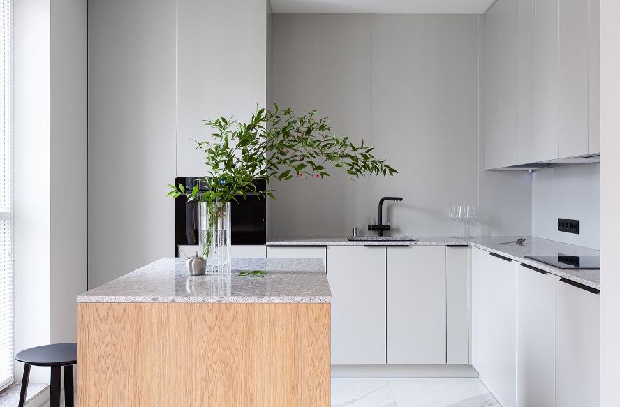 Светлую кухню в стиле минимализм следует разбавлять контрастными деталями. Просторное помещение украшают небольшим количеством комнатных растений. Также подойдут абстрактные картины или чёрно-белые фотографии в простом обрамлении. Разнообразить интерьер можно с помощью оригинальной напольной вазы из керамики или ёмкости со специями.