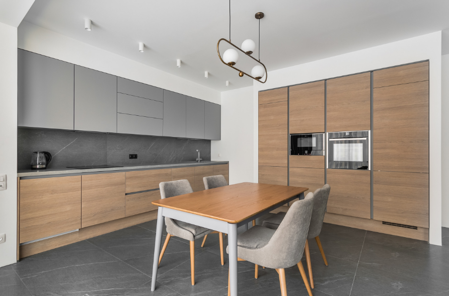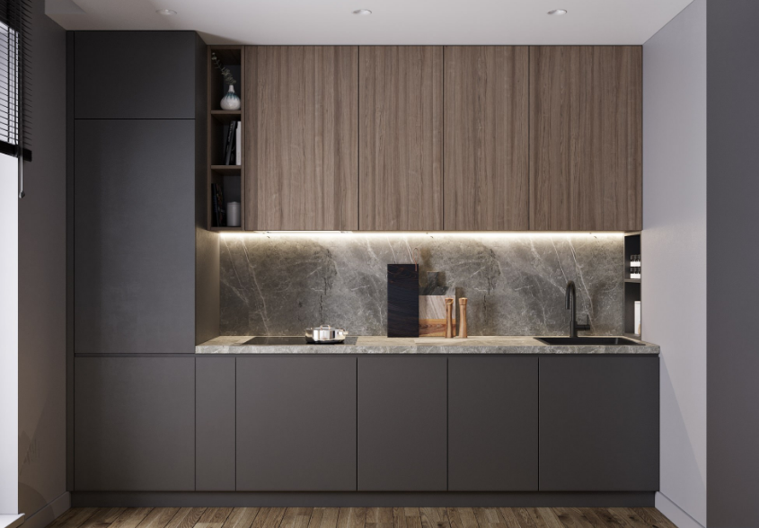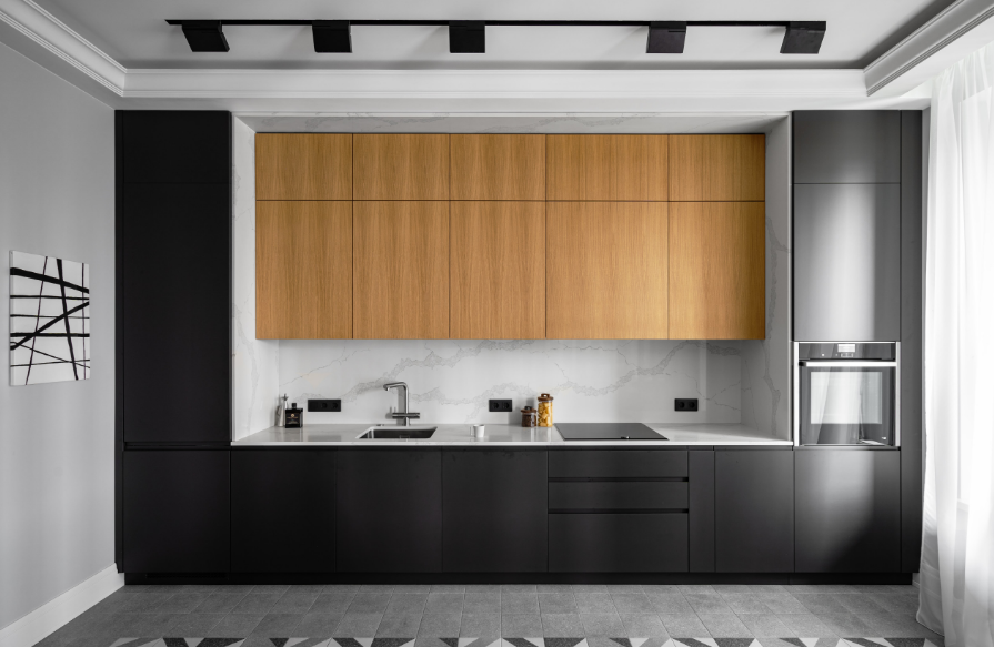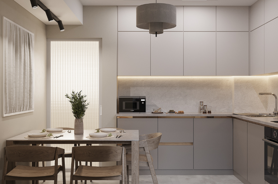 Минимализм в дизайне кухни достигается за счёт гармоничных сочетаний в отделке. Все покрытия легко комбинируются между собой, подчёркивая простоту стиля.