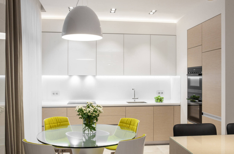 Для подсветки обеденной и рабочей зон подойдут точечные светильники, аккуратные геометрические диски, галогеновые и светодиодные ламы. Подсветку также используют для ниш и предметов мебели для создания парящего эффекта.