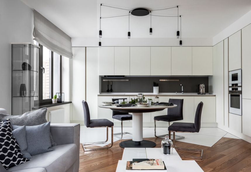 При оформлении кухни, совмещённой с гостиной, можно добиться по-настоящему элегантного интерьера. Минимализм прекрасно подходит для малогабаритной комнаты: светлые тона и строгость линий дарят ощущение дополнительного пространства.