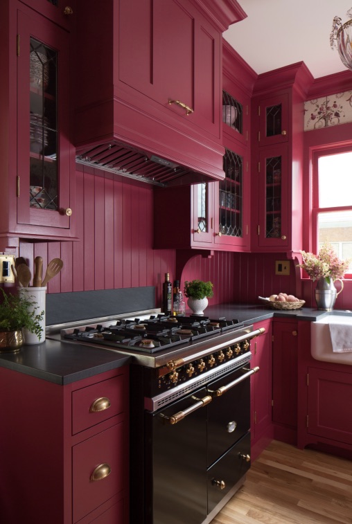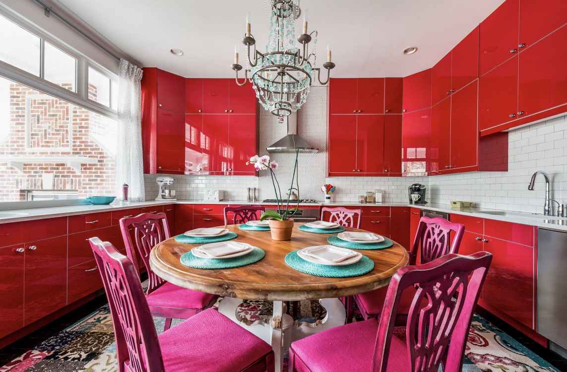 Красный обладает сильной энергией, делится ей, но при обилии красного также и отнимает силы. Стимулирует работу нервной системы, кровообращение, пробуждает скрытое лидерство, добавляет уверенности. Кухонный гарнитур нейтрализуется зеленым и его оттенками, сочетается с холодными и теплыми тонами, белым и черным.