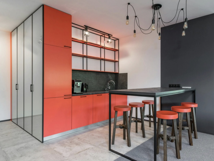 - Лофт. Кухонный красный гарнитур бывает глянцевым и матовым, совмещать в себе новизну и потертость ретро, комбинируется с красным кирпичом, белой отделкой, серой столешницей из нержавейки. В мебели может присутствовать стекло, алюминий.