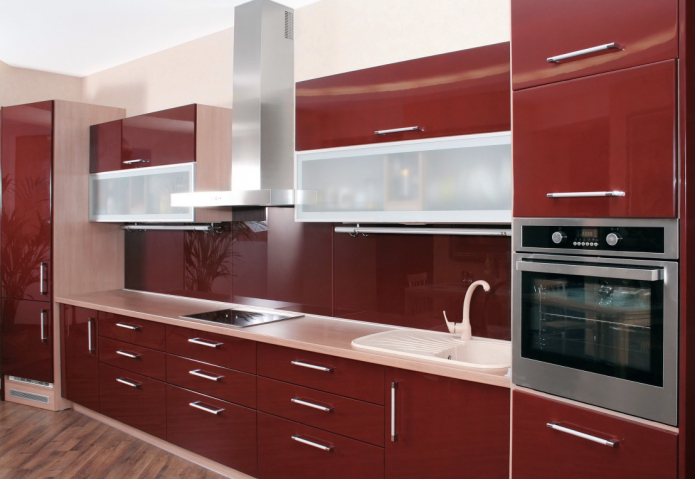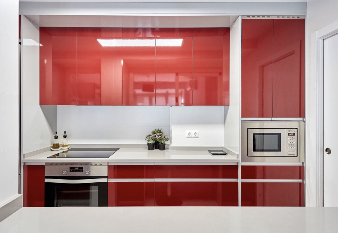 Наносится на МДФ или ДСП панель. Это долговечный гарнитур, который не потеряет форму и алый цвет. Красный фасад с алюминиевыми вставками и стеклом увеличивают срок эксплуатации гарнитура.