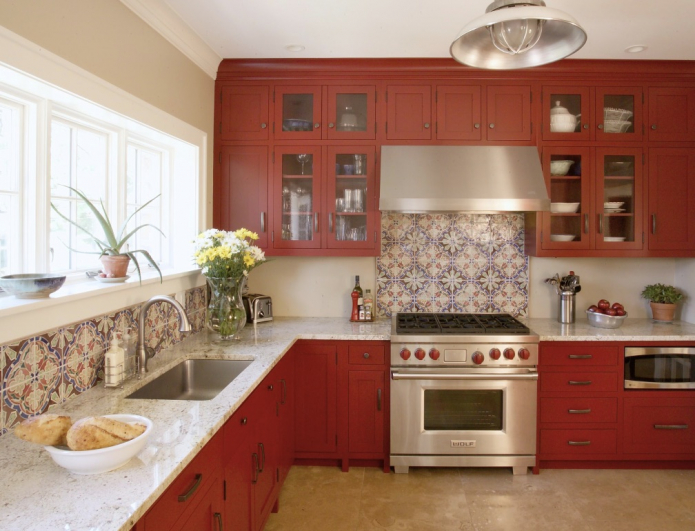 - Кантри. Кухонный красный гарнитур в бледном или темном оттенке с потертостями по старину, комбинируется с деревянной фурнитурой, коричневыми цветами фартука, столешницей из мозаики или массива.