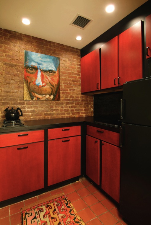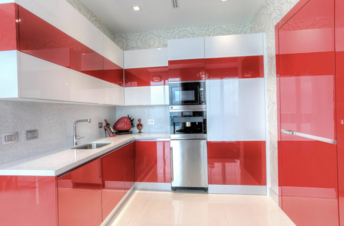 - Комбинировать в интерьере красный гарнитур с белым потолком, светлыми стенами и глянцевым полом.