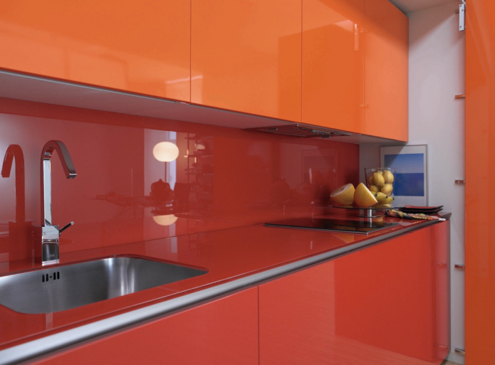 Отражает освещение, подходит для любой кухни, поддается уборке, но и легко загрязняется следами от рук. Глянец в красных тонах комбинируется с матовым напольным покрытием и рабочей поверхностью во избежание перенасыщения блеска.