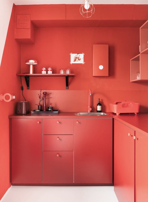 - Выбирать приглушенные или яркие оттенки, глубокий красный на кухне допустим при комбинации двухцветных фасадов.