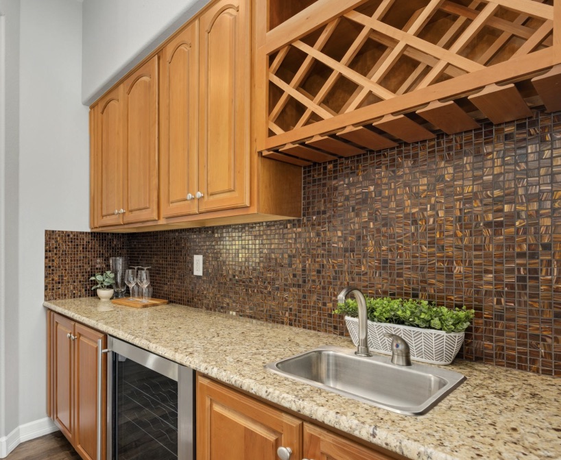 Какой камень предпочесть? Те, что имеют пористую структуру, не подходят – они будут впитывать в себя кухонные запахи и грязь, уход за ними очень сложен, и внешний вид такой фартук потеряет очень быстро. Поэтому известняк или травертин для кухни лучше не применять. Мрамор и гранит – более плотные материалы, но и они могут впитывать красители, содержащиеся, например, в морковном или свекольном соке.