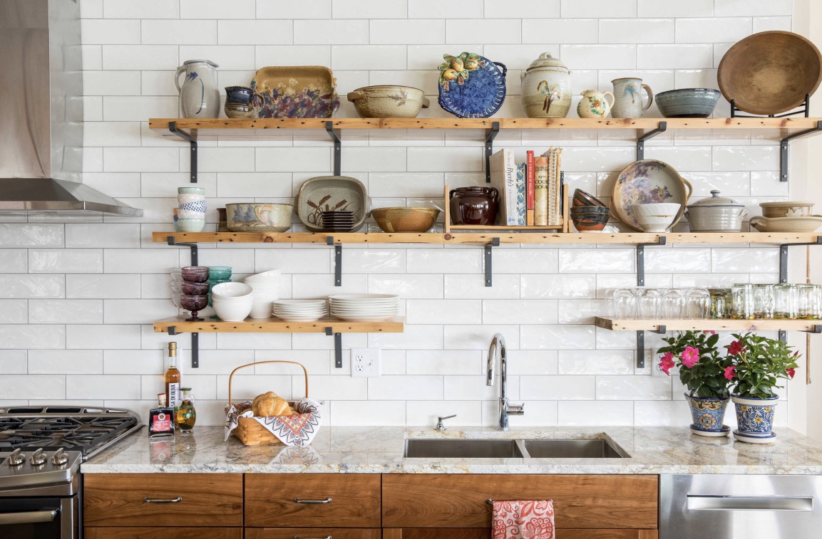 Открытые полочки делают кухонный интерьер более выразительным и при этом очень уютным и домашним. За счет красиво расставленной посуды обстановка наделяется особой индивидуальностью.