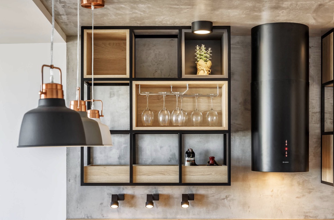 Кухонное пространство в стиле лофт, дополняют более массивными полками из деревянных досок или металла, обладающие незаконченным внешним видом. Достаточно смелым дизайнерским решением являются конструкции из бетона или кирпича. В оформлении данных изделий применяют ржавые трубы, различные краны, болтики, винты и металлические прутья.