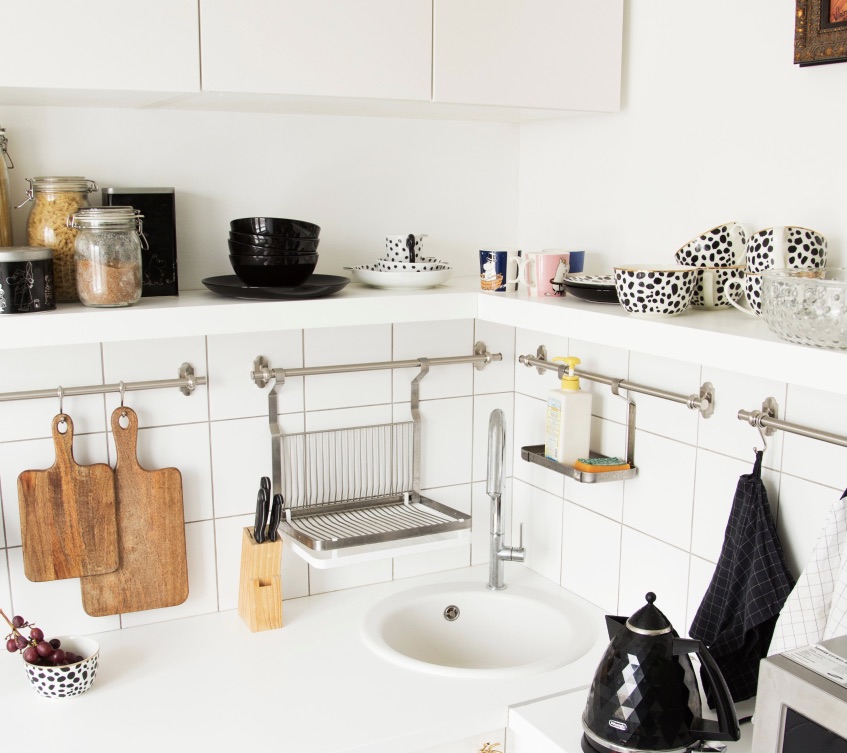 Полочки с крючками, являются очень практичным аксессуаром, совмещающим в себе сразу две функции. Подобные изделия одновременно подходят для размещения губок и например, развешивания полотенец.