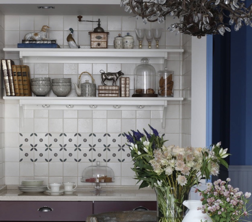 Свободную стену над столом, часто оформляют полками для декоративных предметов или различных небольших баночек с приправами. В данной зоне очень выигрышно будут смотреться модели с невидимыми креплениями, которые сливаются с поверхностью стены и становятся с ней единым целым.