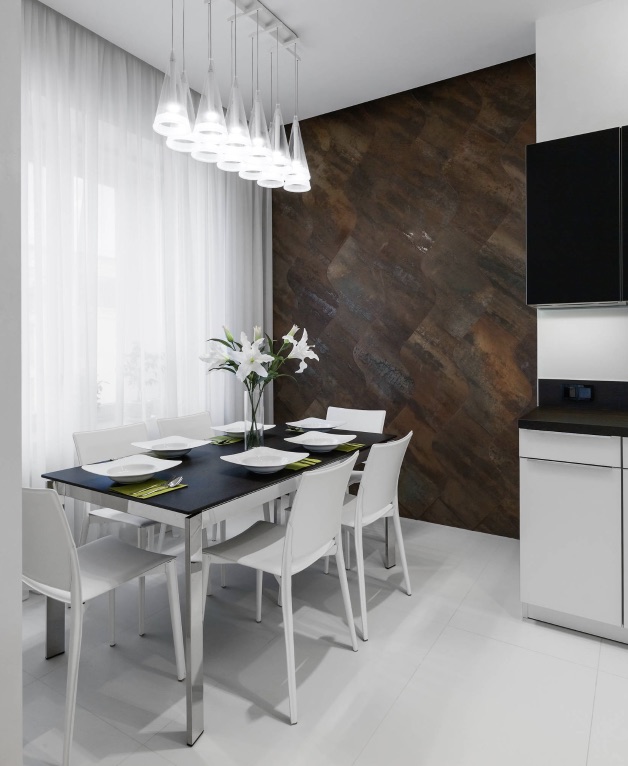 С точки зрения правил безопасности, стена в обеденной зоне – наиболее оптимальный вариант, поскольку находится вдали от мойки и газовой плиты.