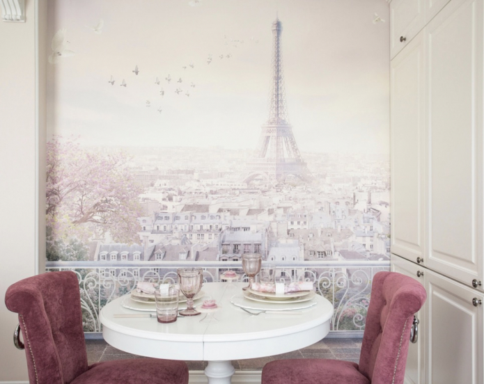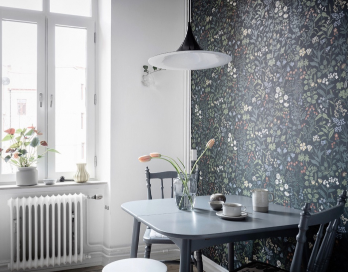 Для маленькой кухни – это идеальный вариант. Чтобы создать обстановку, которая выглядит дороже, чем есть на самом деле, стоит приобрести один рулон дорогих дизайнерских обоев и украсить ими обеденную зону.
