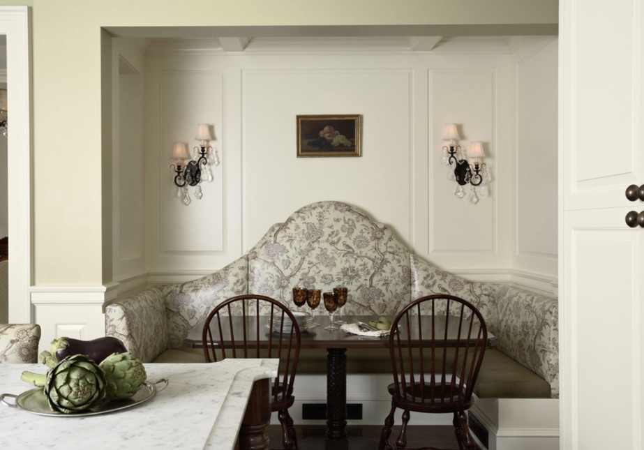 Если кухня выдержана в стиле современная классика, участок над обеденной группой стоит выделить молдингами, заключив изящные светильники в рамы.