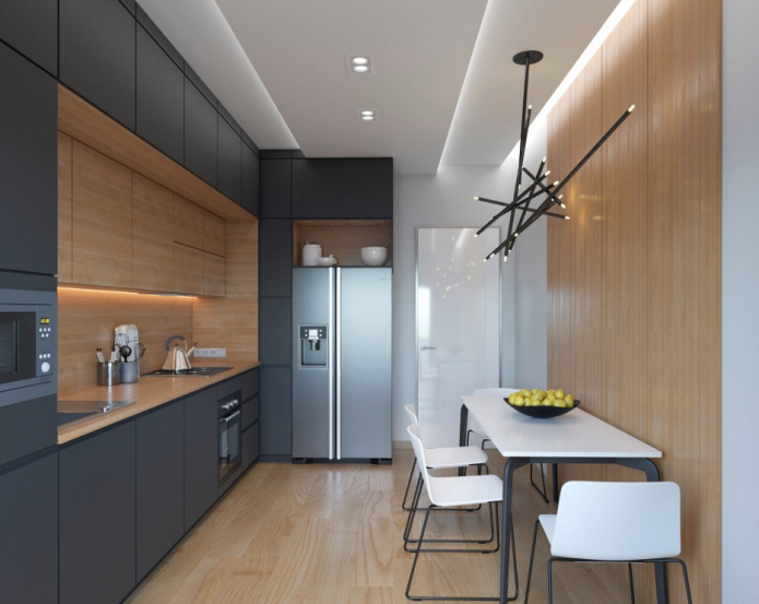 Второй вариант более практичен, так как играет роль дополнительной системы хранения для посуды или заготовок. Но подобное решение уместно лишь в просторных кухнях площадью 9 кв.м и выше.