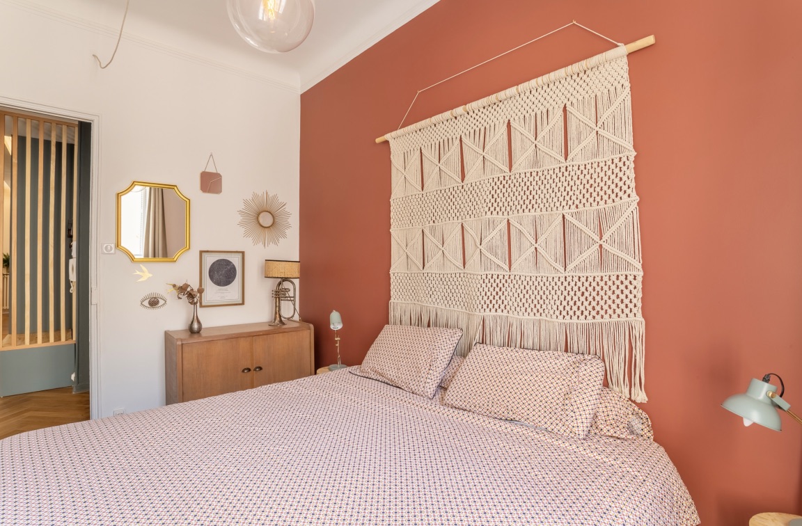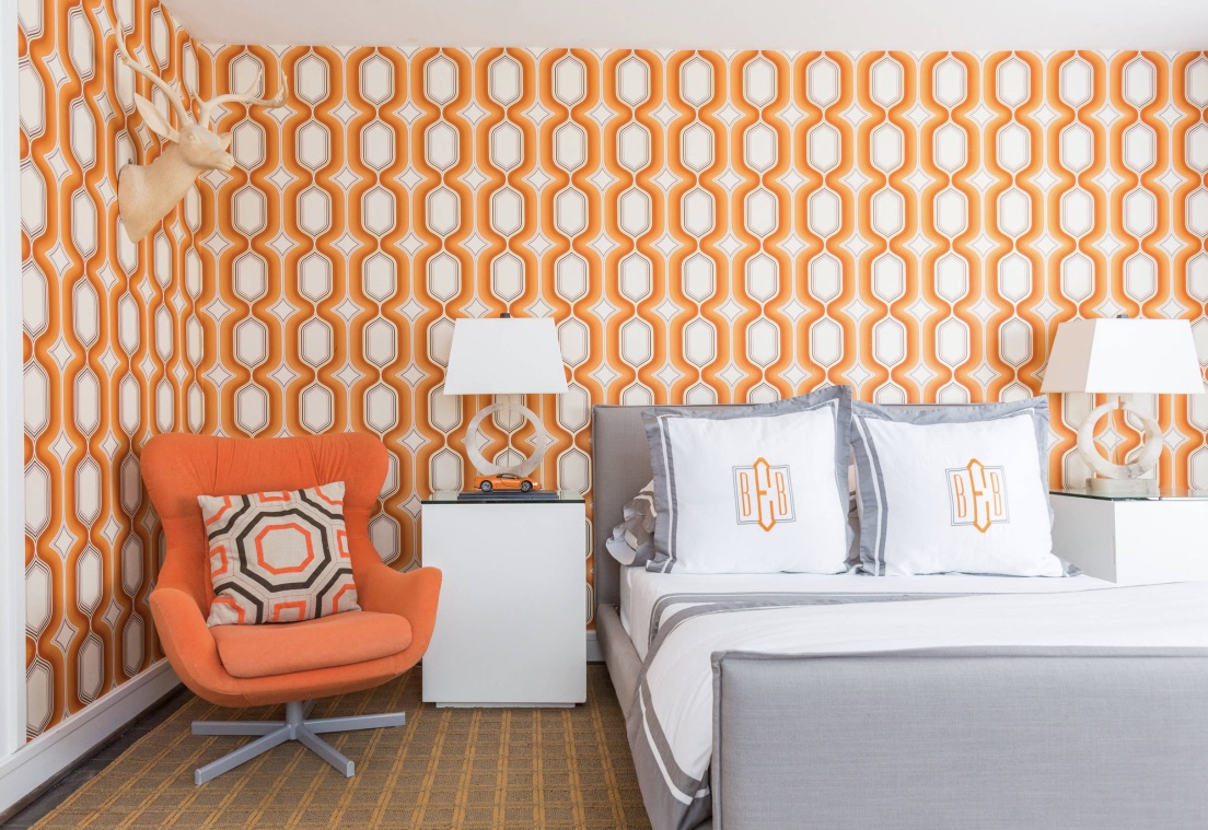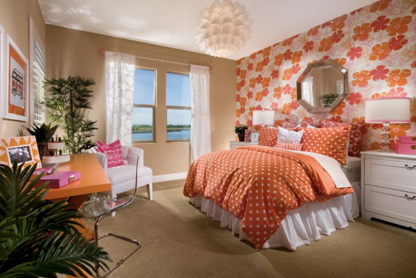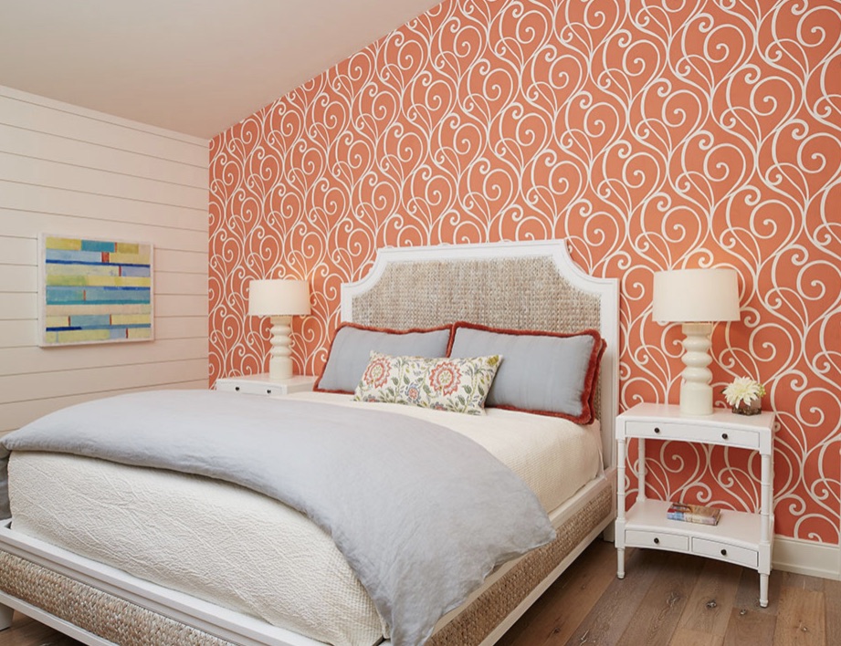 - Стена. Одна из стен выбирается акцентной – обычно это стена у изголовья постели. Ее окрашивают краской, либо оклеивают обоями, содержащими оранжевый в качестве основного. На той же стене можно разместить светильники, картины либо другие элементы декора, следя за тем, чтобы по тону они гармонировали с основным фоном.