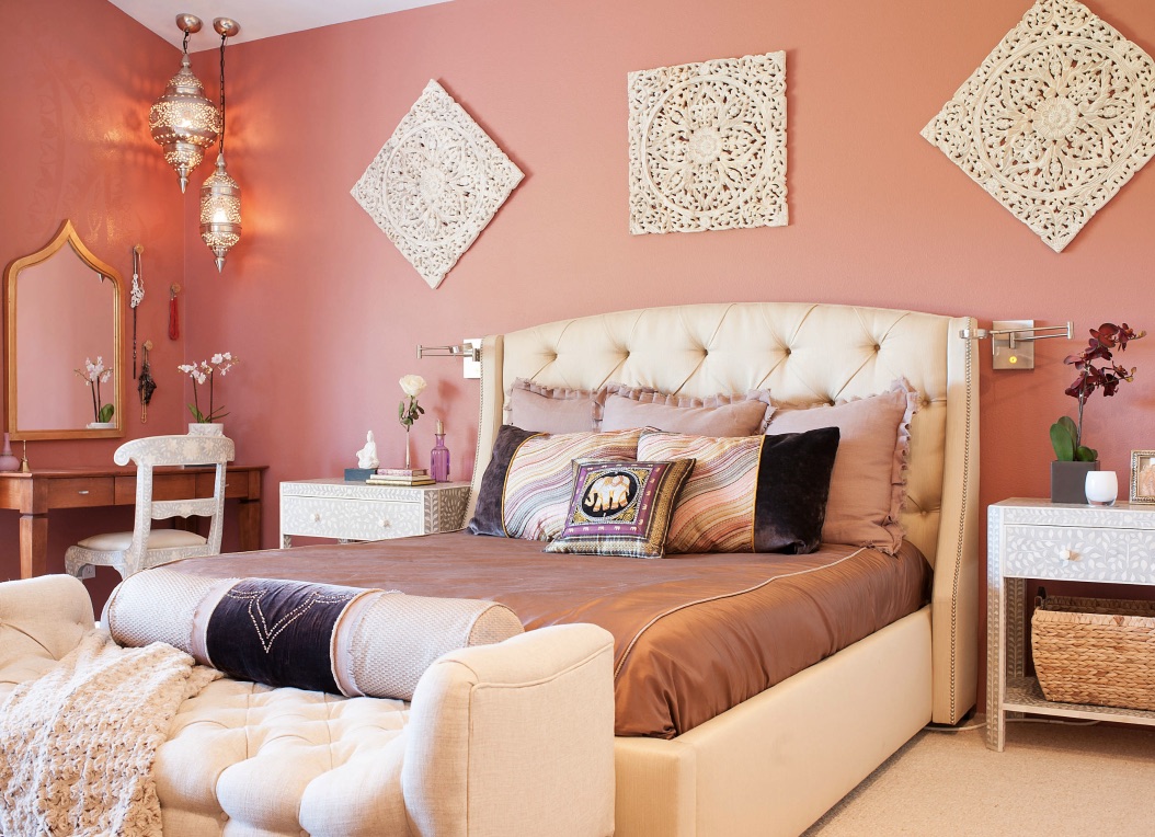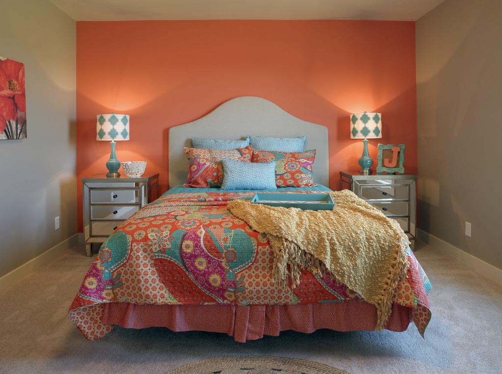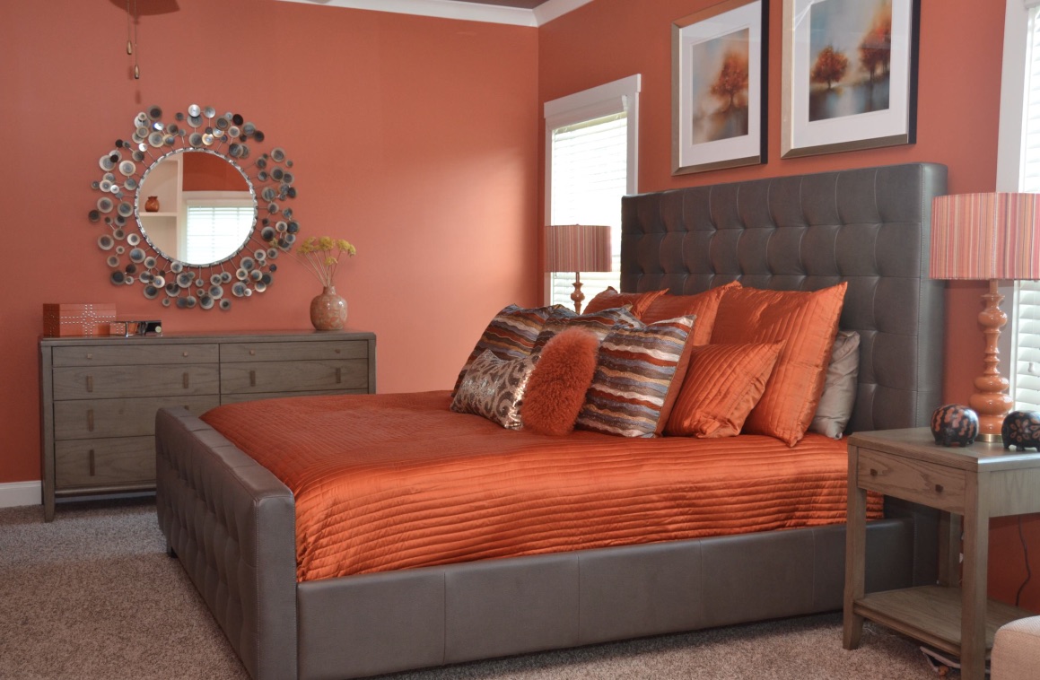 - Оттенки. Возможен вариант, когда в спальне в оранжевом цвете выполнено практически все – от отделки стен до покрывала на кровати. В зависимости от оттенка, это может выглядеть очень ярко и агрессивно или, напротив, нежно и успокаивающе.