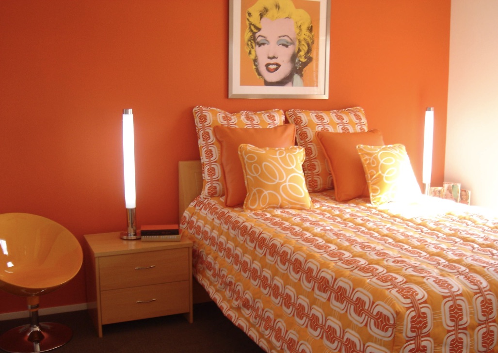 Оранжевый – активный цвет, относящийся к теплым тонам. Эти его свойства накладывают некоторые ограничения на применение. С особой осторожностью пользуйтесь цветом, если окна спальни выходят на южную сторону. Это относится в первую очередь к дизайну спальни, в котором используются на большой площади насыщенные оттенки. В таком случае есть риск возбуждения нервной системы, что для такого помещения, как спальня, нежелательно.