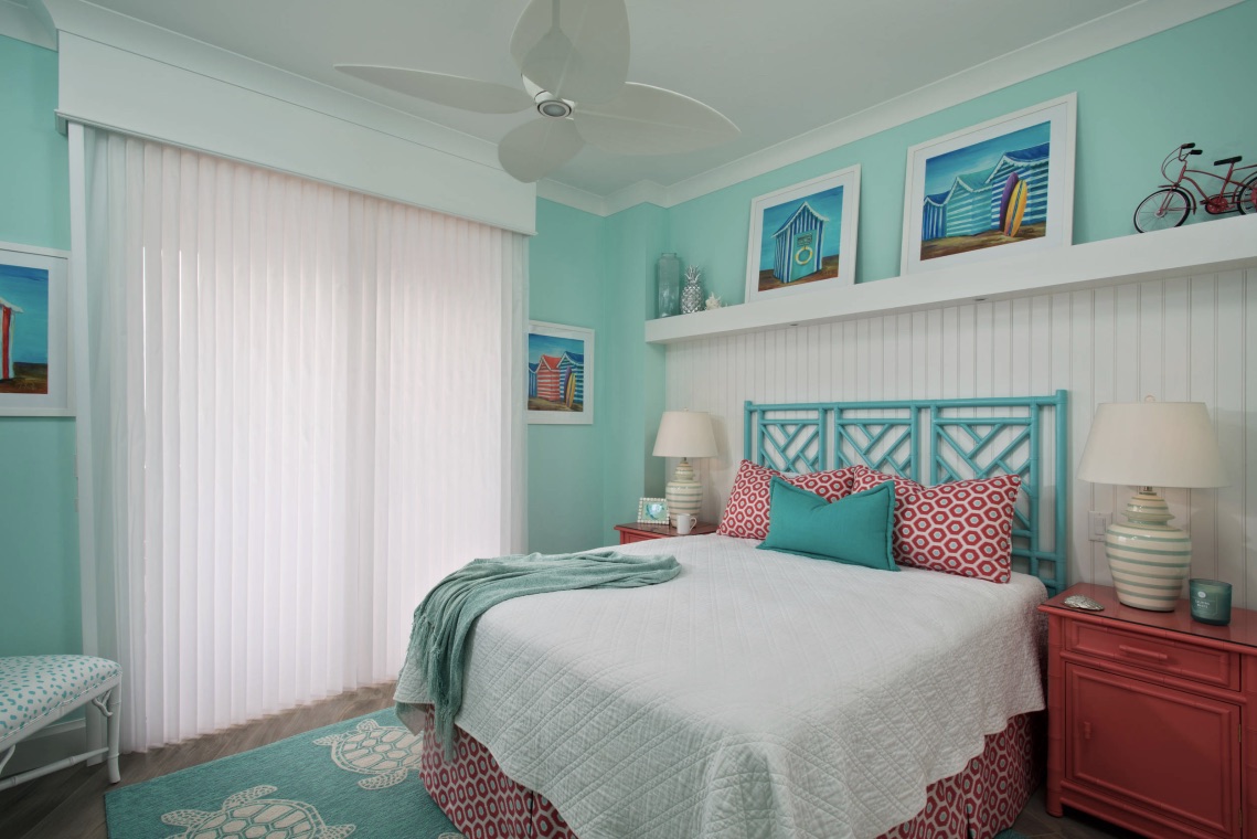 На первый взгляд комбинация кажется слишком яркой, но она представляет собой природное сочетание цвета морской волны и кораллового: сложные тона выглядят стильно и небанально. Считается, что оттенки бирюзового благоприятно воздействуют на психику человека, снимая раздражённость, усталость и перенапряжение, поэтому цвет морской волны великолепно подходит для спальни.
