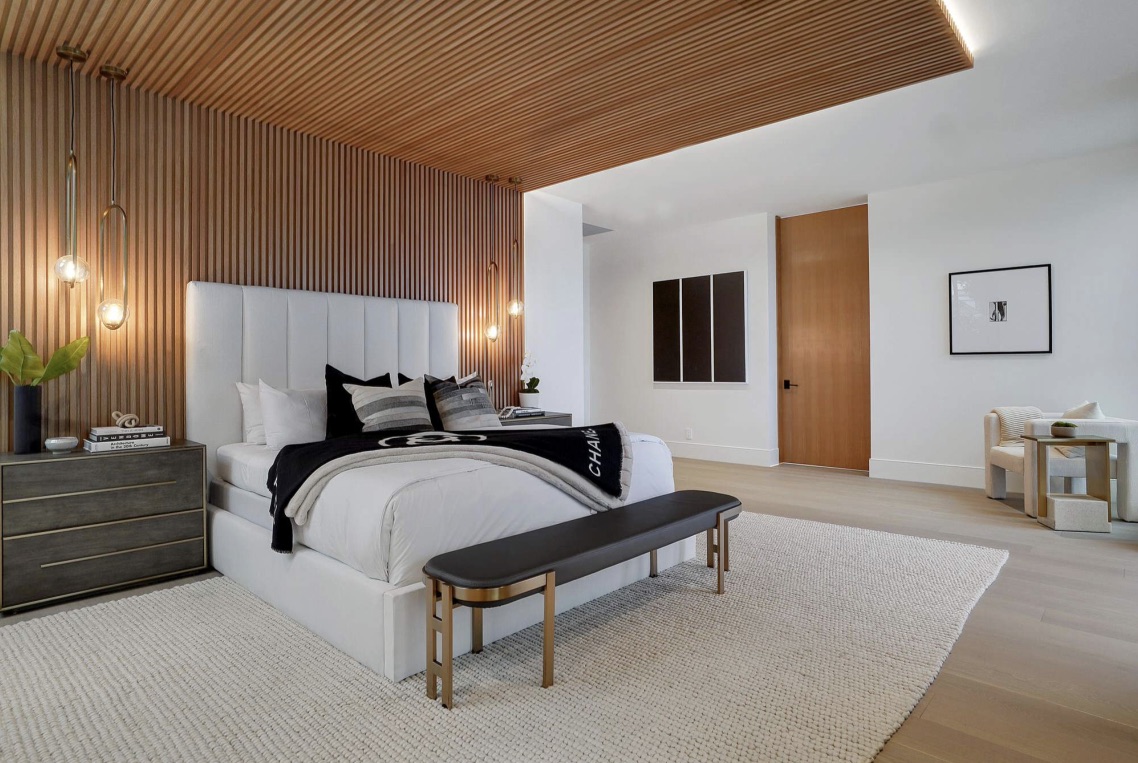 Универсальное сочетание, которое понравится поклонникам минимализма и скандинавского стиля. Белый успешно расширяет пространство, наполняя спальню воздухом, а цвет натурального дерева придаёт теплоты и дарит ощущение гармонии с природой. Чёрные детали выступают акцентами и добавляют контраста, словно обрамляя светлый интерьер.