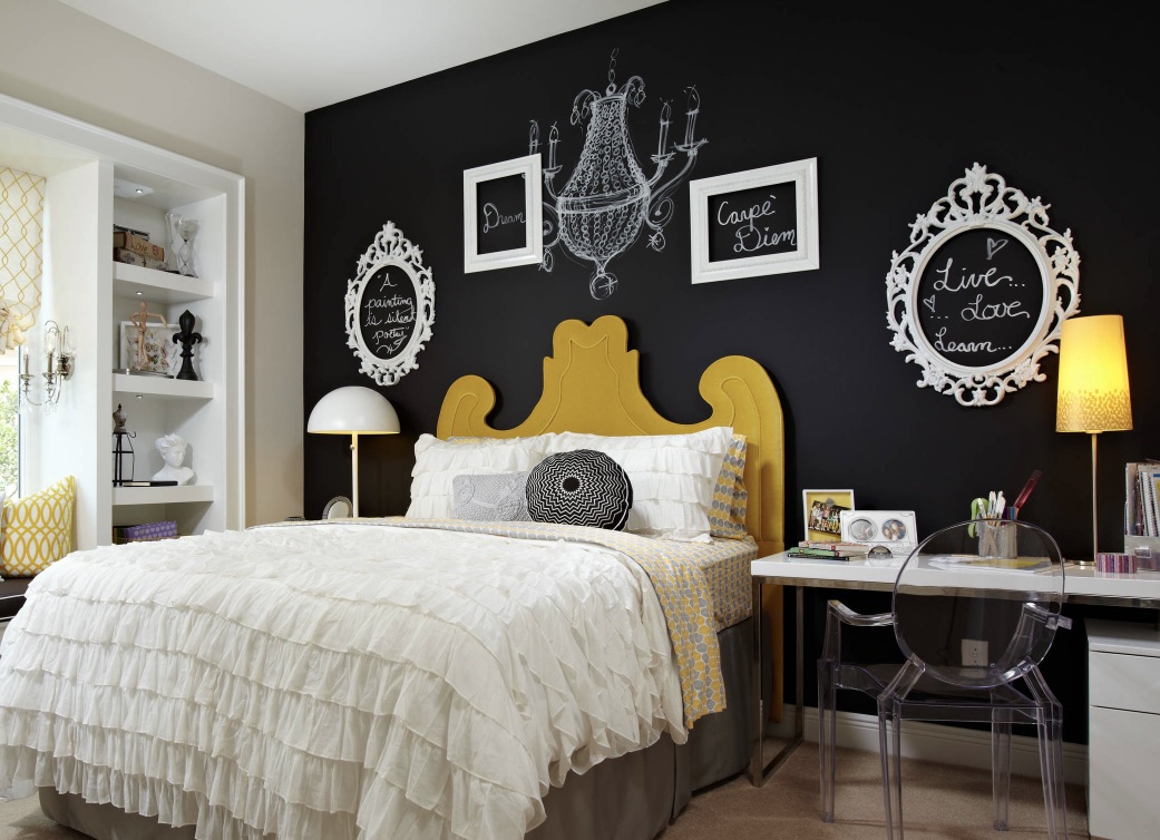 Это сочетание цветов в интерьере спальни выглядит неординарно и даже дерзко, поэтому подходит далеко не всем. Комбинация понравится творческим личностям и смелым молодым людям. Делая графитовый цвет основным, владелец гарантированно придаёт помещению незабываемый вид.