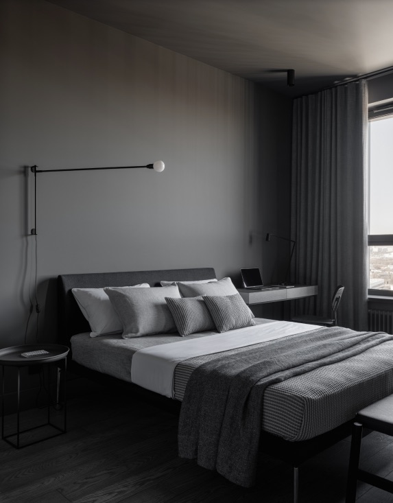 Светлый. Даже большая монохромная комната будет казаться неуютной пещерой, но светлые пятна не дадут этому случиться. Самая простая идея заключается в использовании светлого текстиля — постельного, штор, обивки изголовья.