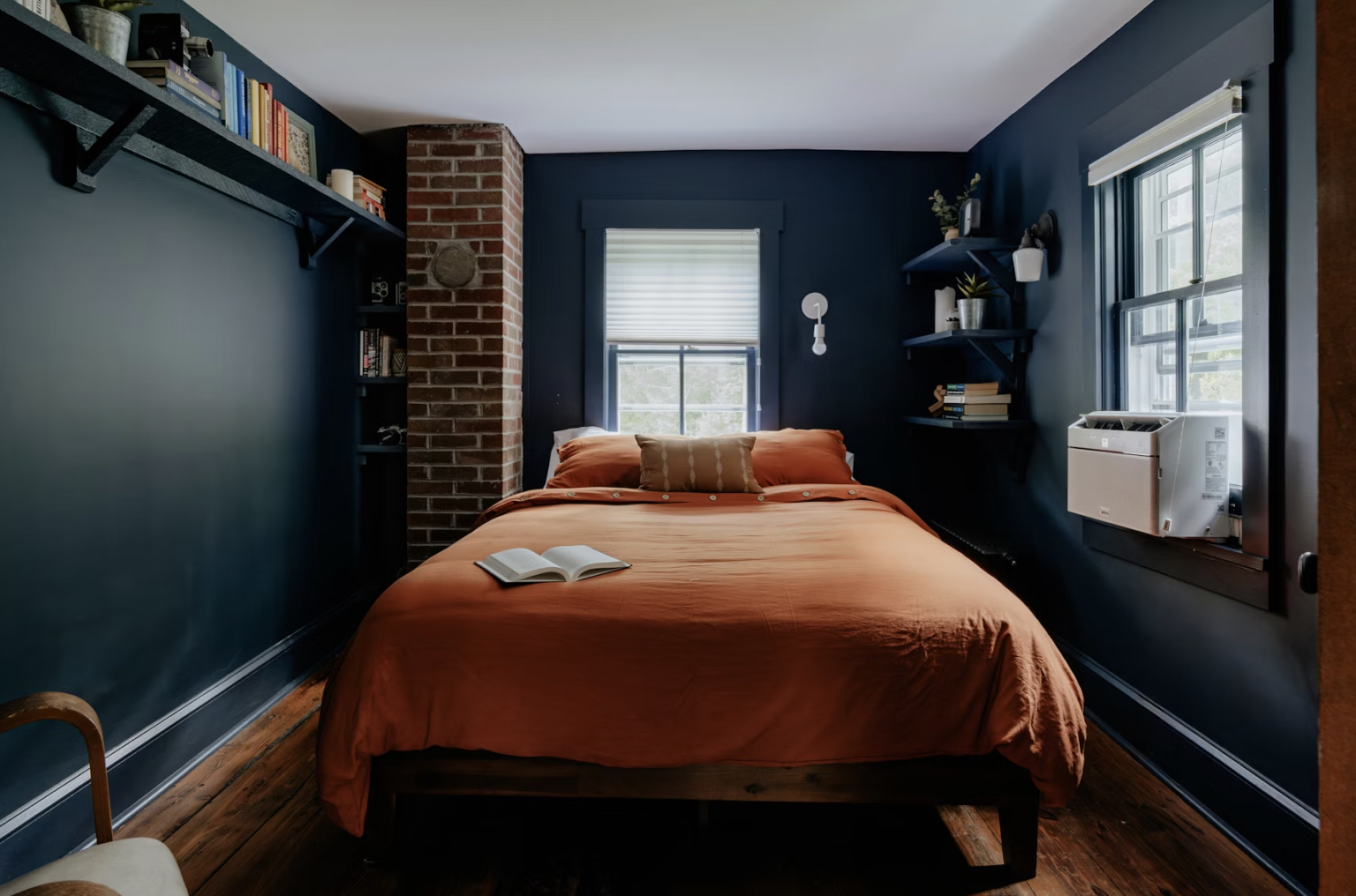 Не бойтесь окрашивать не только стены, но и потолок. Темная спальня не станет визуально ниже, если в обстановке будет белый молдинг или светлые лампы. А в случае глубокого оттенка пола, потолка и мебели, но светлых стен — пространство вообще расширится.