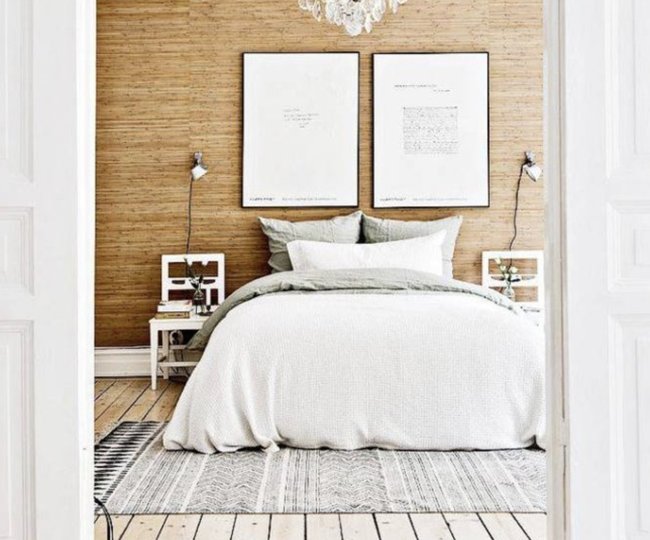 Скандинавский стиль предполагает, что в дизайне обязательно будет присутствовать дерево, например, ветки. А как насчёт пенька в качестве тумбы? Это смелое решение поможет придать неповторимый облик спальне.