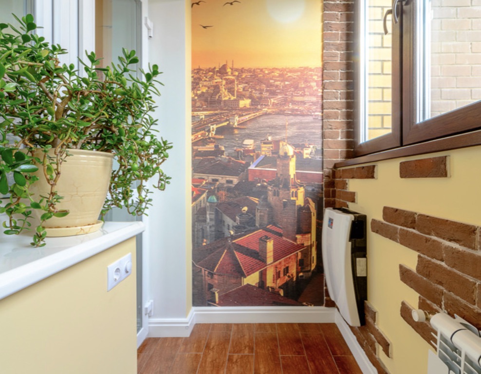 На фото закрытый балкон, стены которого отделаны плиткой в виде красного кирпича с белой затиркой.