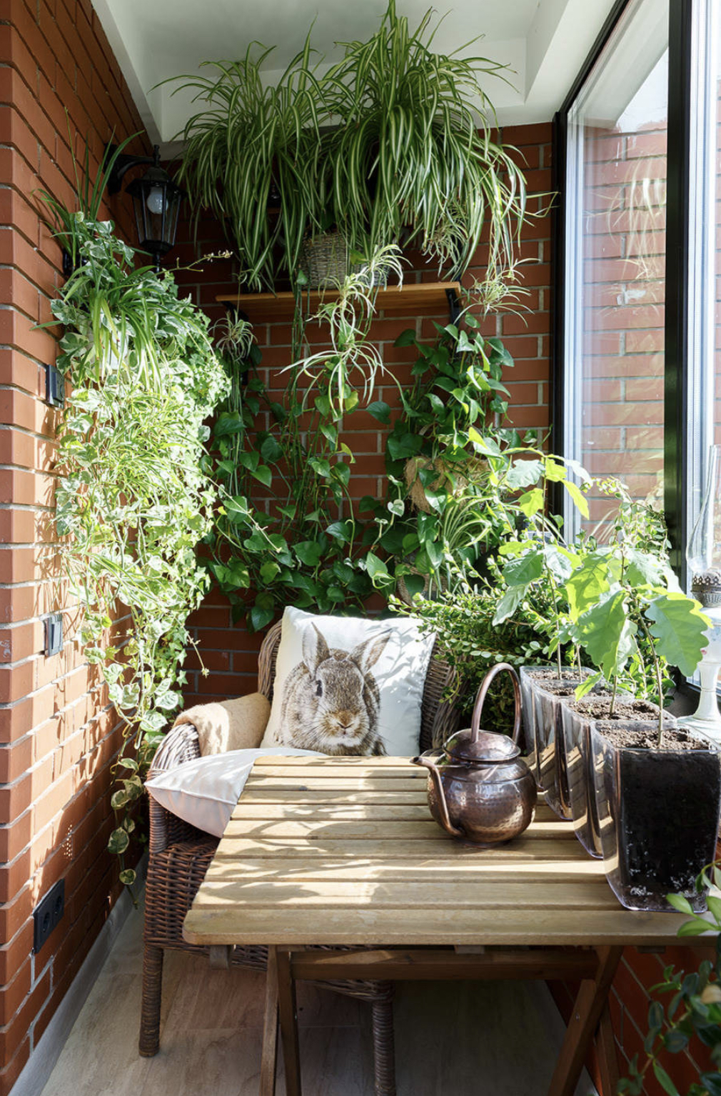 На маленькой лоджии используйте вертикальный способ размещения. Поставьте растения на полки или повесьте несколько горшков на перилах. Помещение, оформленное в светлых тонах, еще больше сделает акцент на зелень.