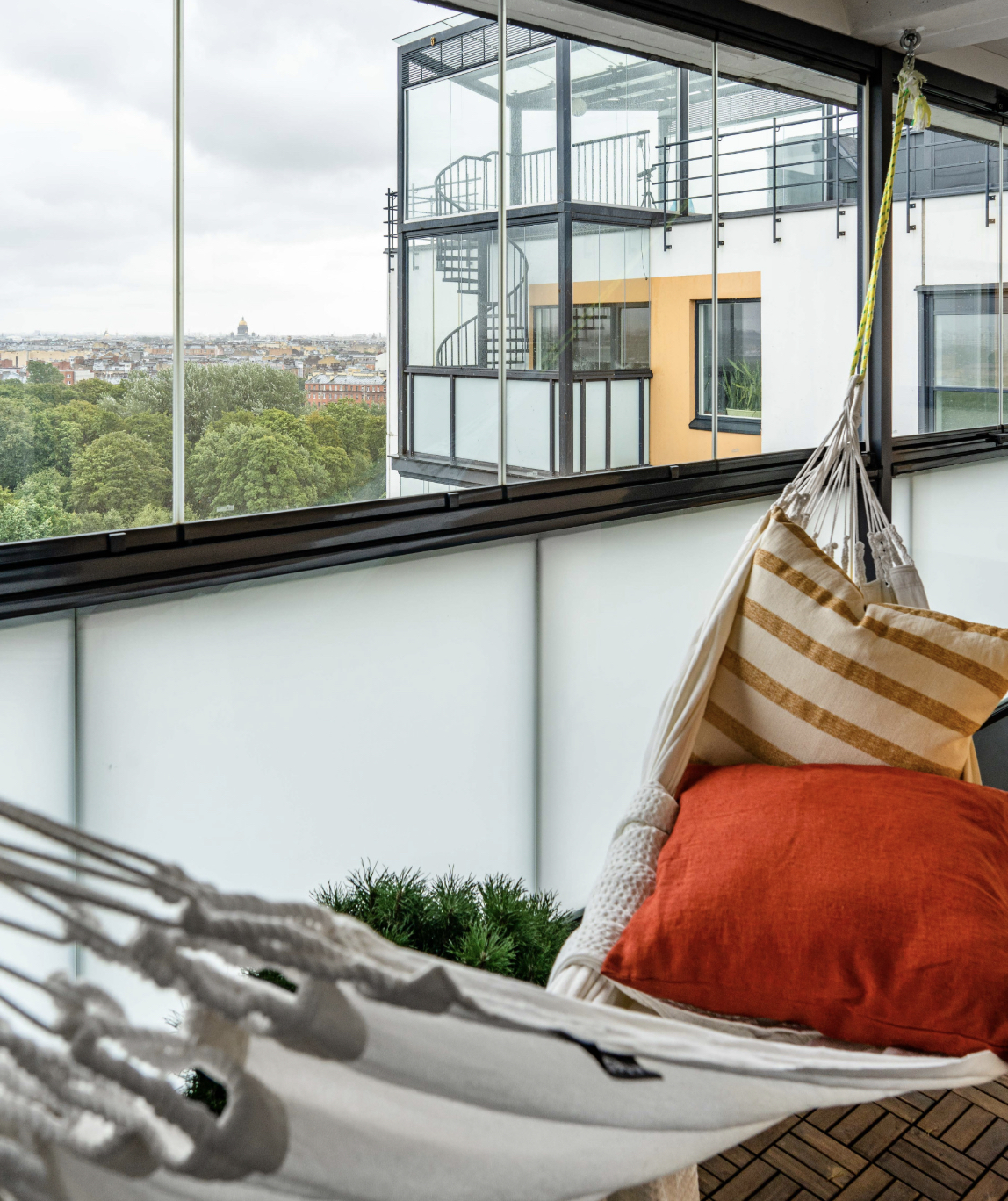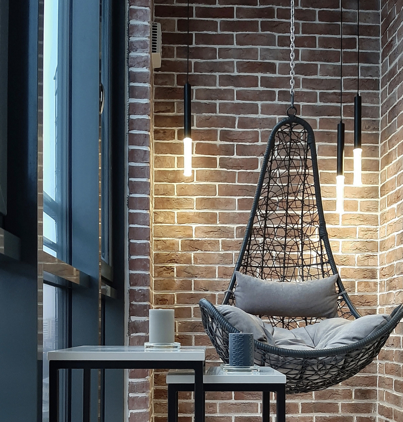 Для уютного уединения поставьте на лоджии подвесное кресло. Такой современный предмет не занимает много места. Это лучший способ наслаждаться отдыхом в любое время и ощущать качание на качелях.