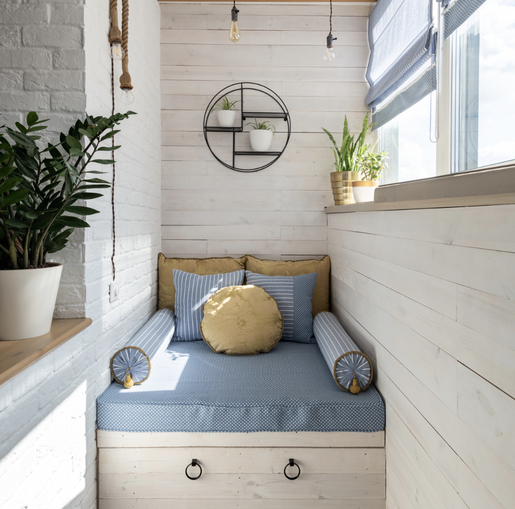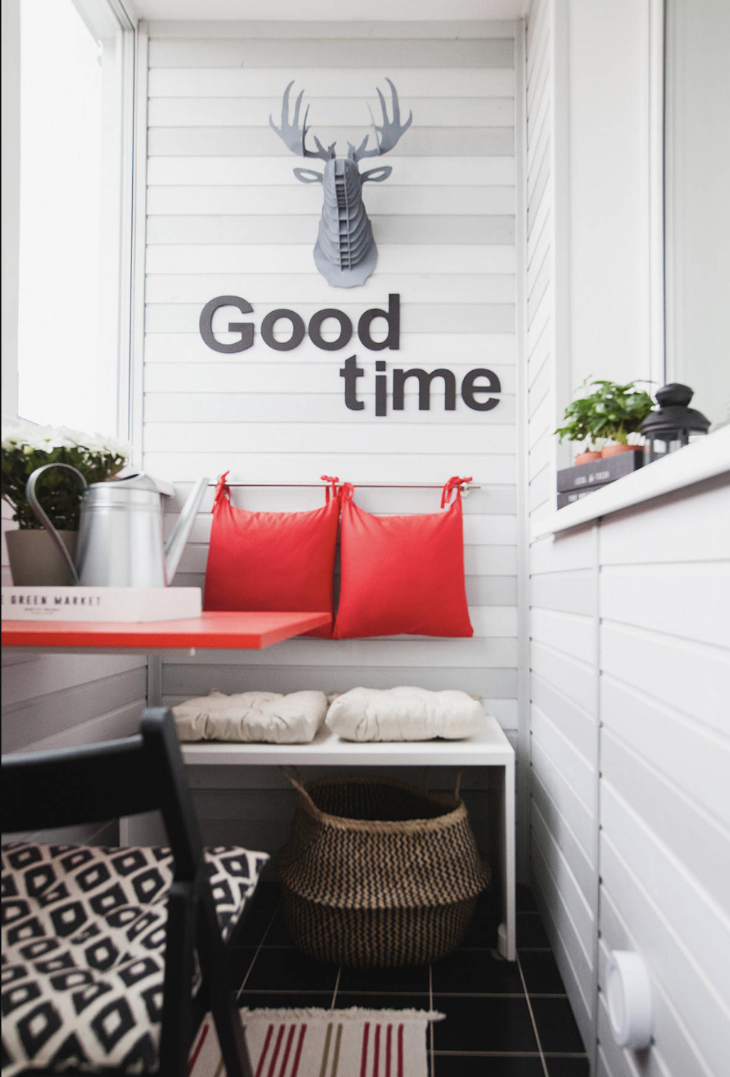 Подушки, пледы, коврики, картины, размещенные на балконе, отлично выполняют свою работу по преображению квадратных метров.