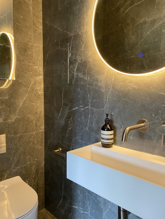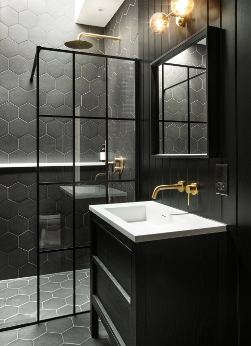 Интерьеры ванных комнат в современном стиле очень требовательны к освещению. Как правило, имеется несколько световых сценариев, которые задействуются в различных ситуациях. Помимо общего света, за который, как правило, отвечают точечные потолочные светильники, в ванных комнатах используют подсветку зеркал, отдельно висящие бра, подвесы в зонах умывания, а также фальш-окна.