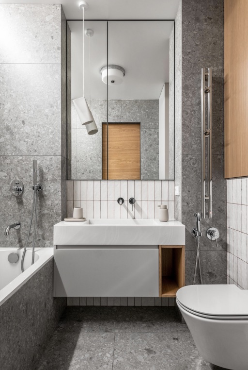 При оборудовании ванной в современном стиле стараются использовать предметы, совмещающие в себе несколько функций. Например, ванну комбинируют с душевой кабиной, что экономит место и повышает комфорт.