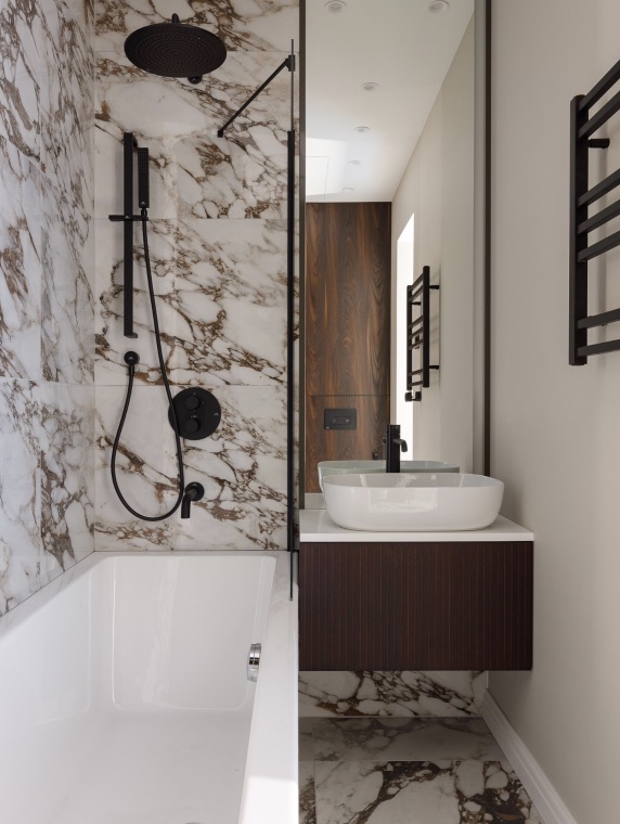 - Натуральные материалы. Мрамор, дерево, натуральный камень – все эти материалы могут использоваться в ванных после соответствующей обработки, облегчающей последующий уход за ними. Стоят они дорого, и применяются в эксклюзивных интерьерах.