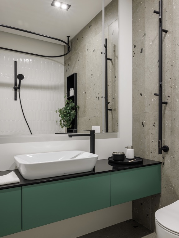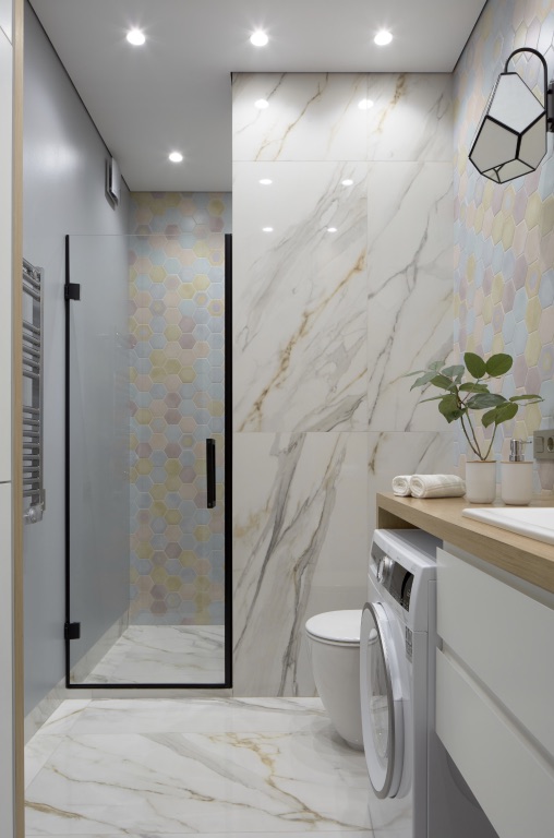 Небольшая площадь ванной не должна стать препятствием для обеспечения современного комфорта. Ванну при этом заменяют на душевую кабину, что позволяет сэкономить площадь и разместить даже постирочную, что в ином варианте было бы невозможно.